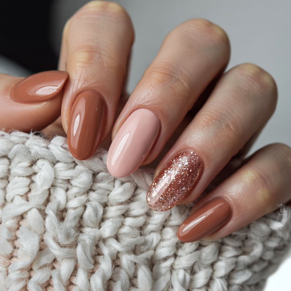 A combination of soft nude, warm brown, and a touch of rose gold glitter makes this look an autumn coziness on the nails. It is such warmth as a cinnamon roll and good book under a knitted blanket, it is so simple, pretty and time-honored.