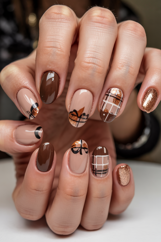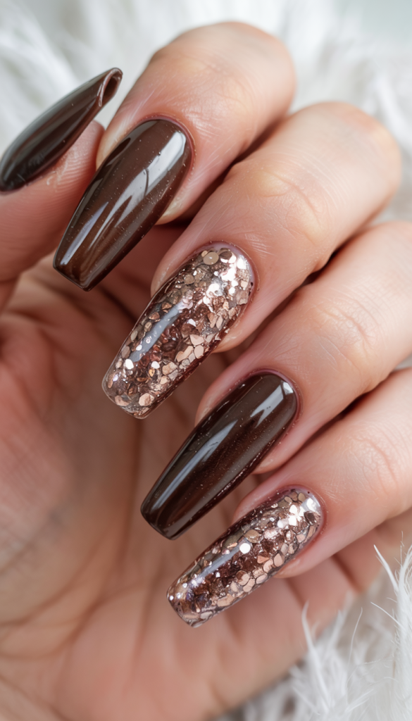 Everything about combining dark chocolate polish and lumpy copper glitter is all glamorous. It is autumn and seems like the golden moment in the autumn, when everything is very warm, profound, and sparkly. These nails practically shimmer with personality and celebration.