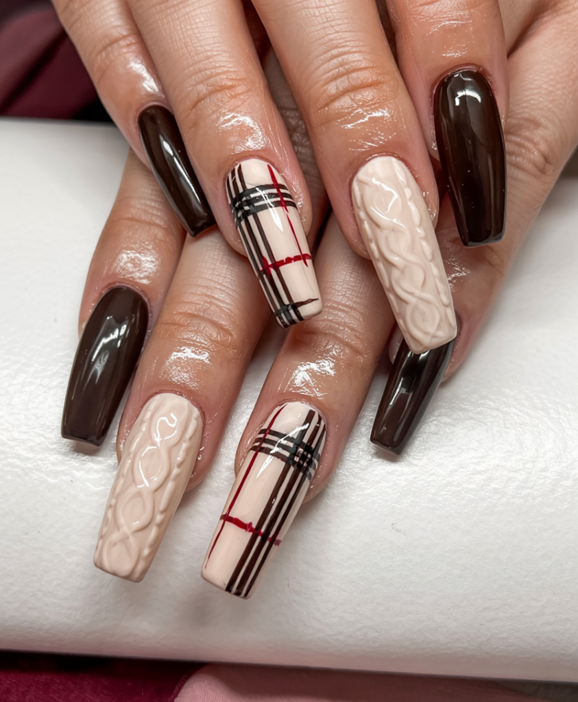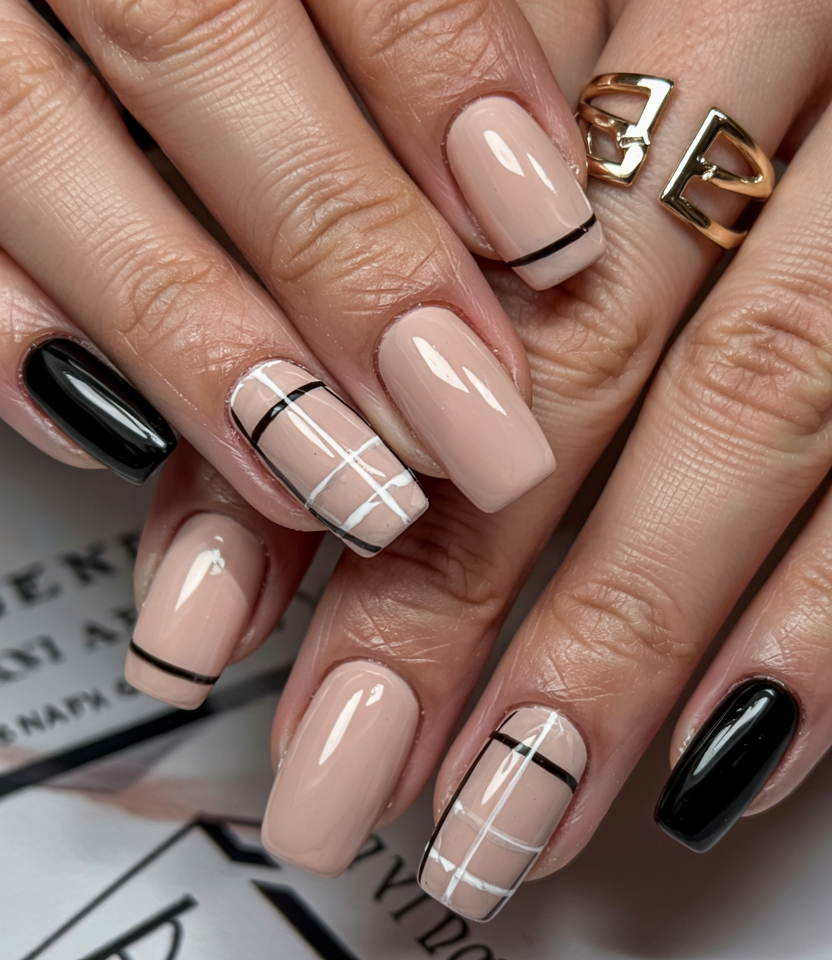 It is one of the best concepts that square lovers will need to experiment in autumn 2025. It is perfect both to admirers of retro patterns or neutral shades, it looks gorgeous on a basic gel short base in case you love less maintenance but still a maximum effect.