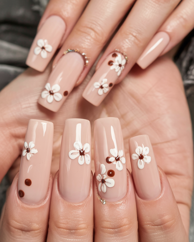 These cuties daisies virtually spring out of the nails because they are sweet in their pure white petals and their dark chocolate centers. The entire outfit on a soft thick nude base feels like the field of wildflowers preserved in the moment amid fresh, light, and joyous.