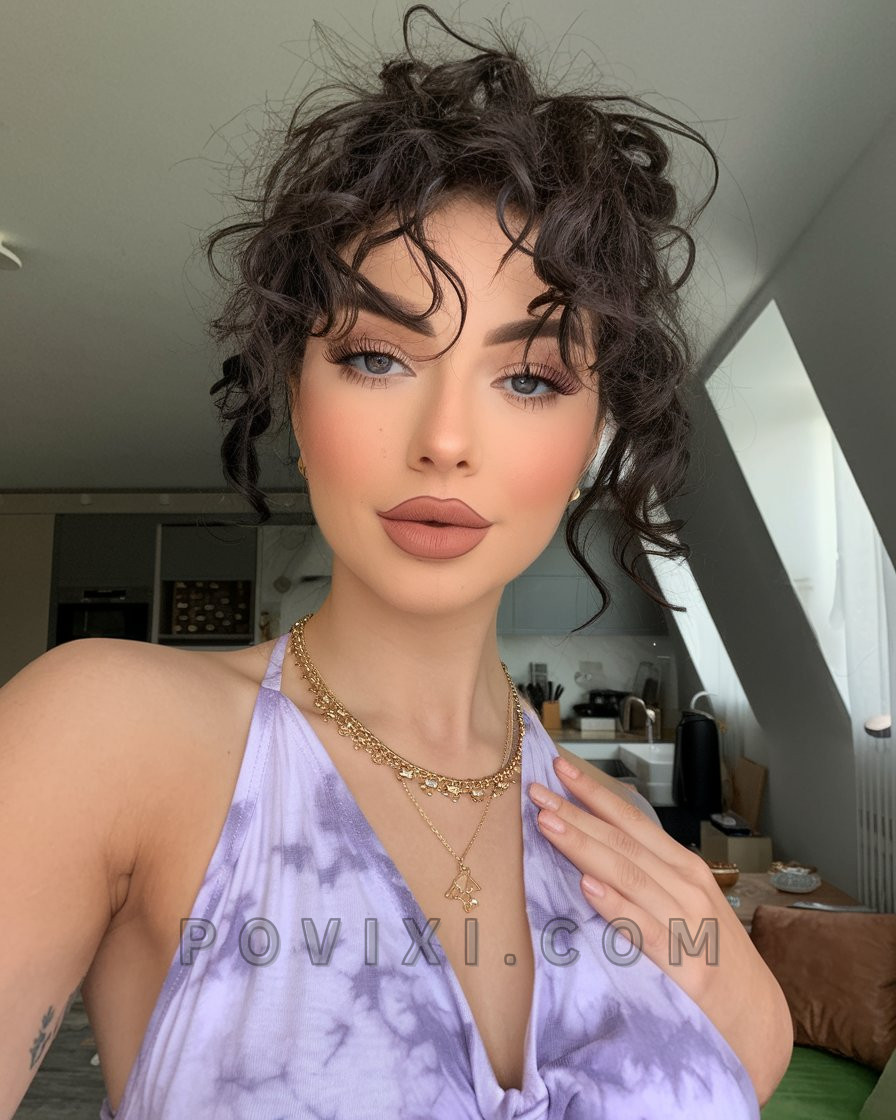 This hairstyle proves that natural curls can look both polished and sultry. The curls are softly defined and styled to frame the face with effortless volume, giving a nod to vintage glamour with a modern twist. The layered gold necklaces paired with a lavender tie-dye halter top add a touch of Y2K revival. For women who love to elevate their curls without overdoing it, this look is a dream. It’s also perfect for pairing with dewy makeup and a soft matte lip. Use a curl-defining cream and diffuse on low heat for soft, controlled volume.