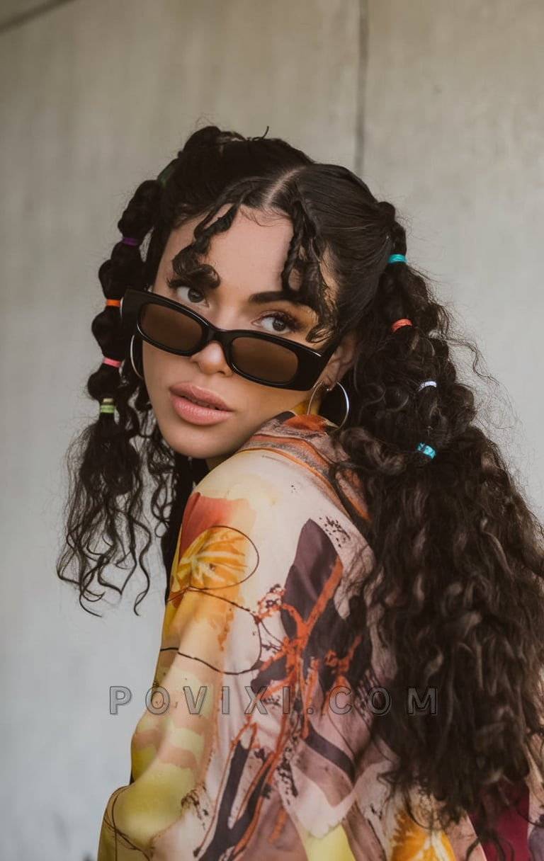 Bold and playful, this look showcases natural curls styled into segmented bubble braids using bright, colorful elastics. Paired with a silky abstract top and oversized sunglasses, the vibe is confident and modern. The mini face-framing twists bring the focus to the cheekbones, and the use of texture is both editorial and cute. It’s perfect for festivals or poolside hangs. Great for 3c curl patterns that hold shape without needing heat.