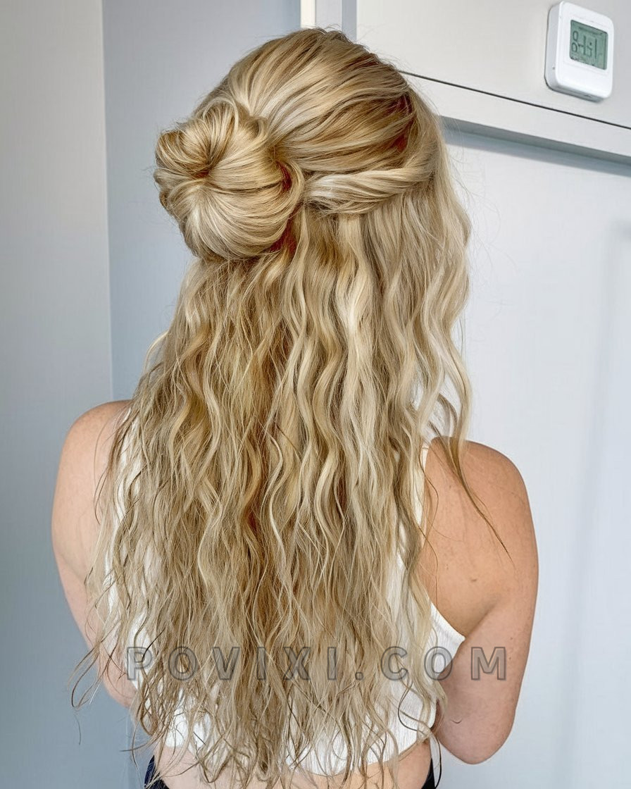 This beach-blonde style is summer simplicity at its finest. The half-up bun adds elevation while keeping hair off the face, and the natural waves flow with lightweight softness. Perfect for lazy beach days, errands in denim shorts, or even casual Fridays at the office, this look works for all hair lengths and types—especially those embracing natural curls. Use sea salt spray for an extra tousled finish and a matte texture.
