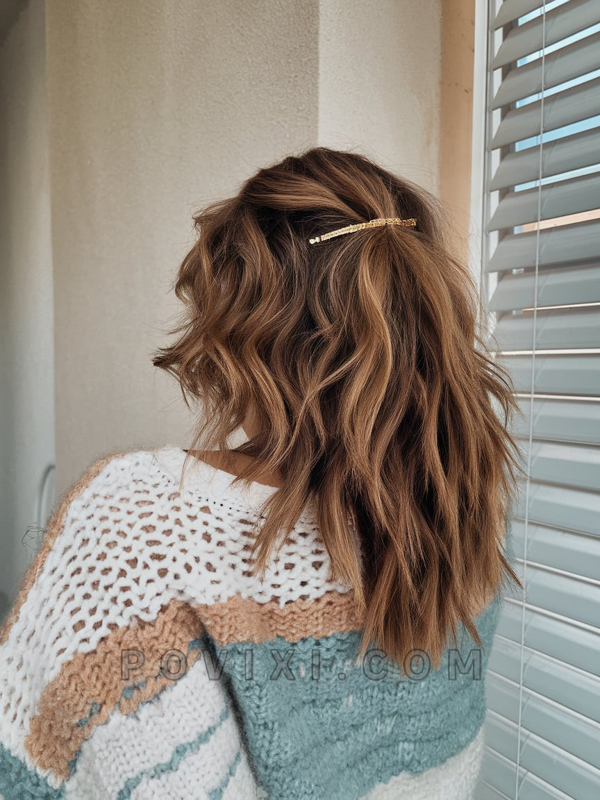 Here’s one for the natural curls short crew: a shoulder-length wavy cut that’s sweet and structured. Tucked back on one side with a dainty gold hair clip, the look is understated yet chic. Perfect for brunches and breezy walks, this style feels like an effortless compliment to lightweight knits and boho fashion. Ideal for anyone who loves a simple, low-maintenance hairstyle that still feels styled.