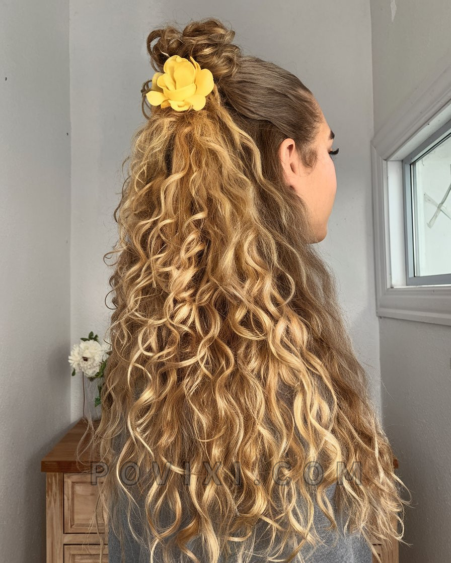A sunflower-inspired dream, this natural curls updo features a messy half-bun decorated with a bright yellow bloom. The ombré blonde curls below offer bounce and summer energy, and the textured strands bring attention to volume and movement. It’s romantic and cute with the perfect splash of sunshine.