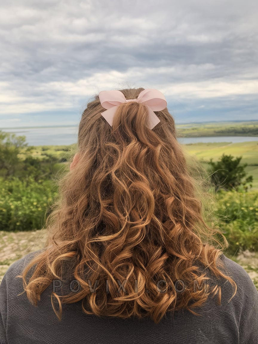 Curly Half-Up Style with Pink Ribbon Bow
