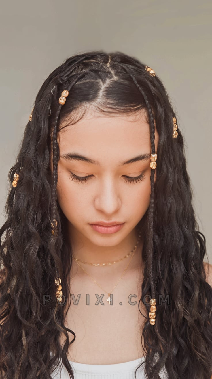 Middle-Part Braids with Beaded Accents
