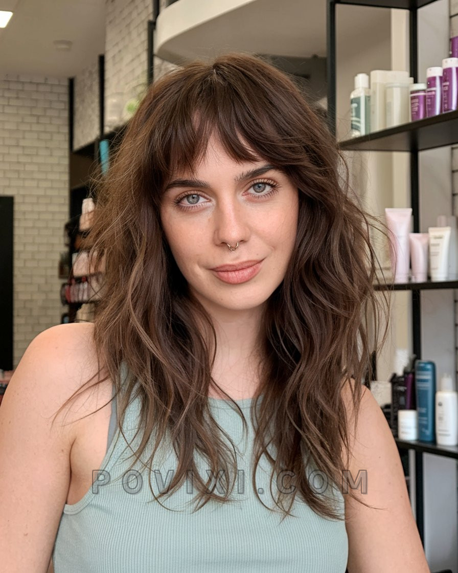 Soft Shag Cut with Tousled Waves and Curtain Bangs