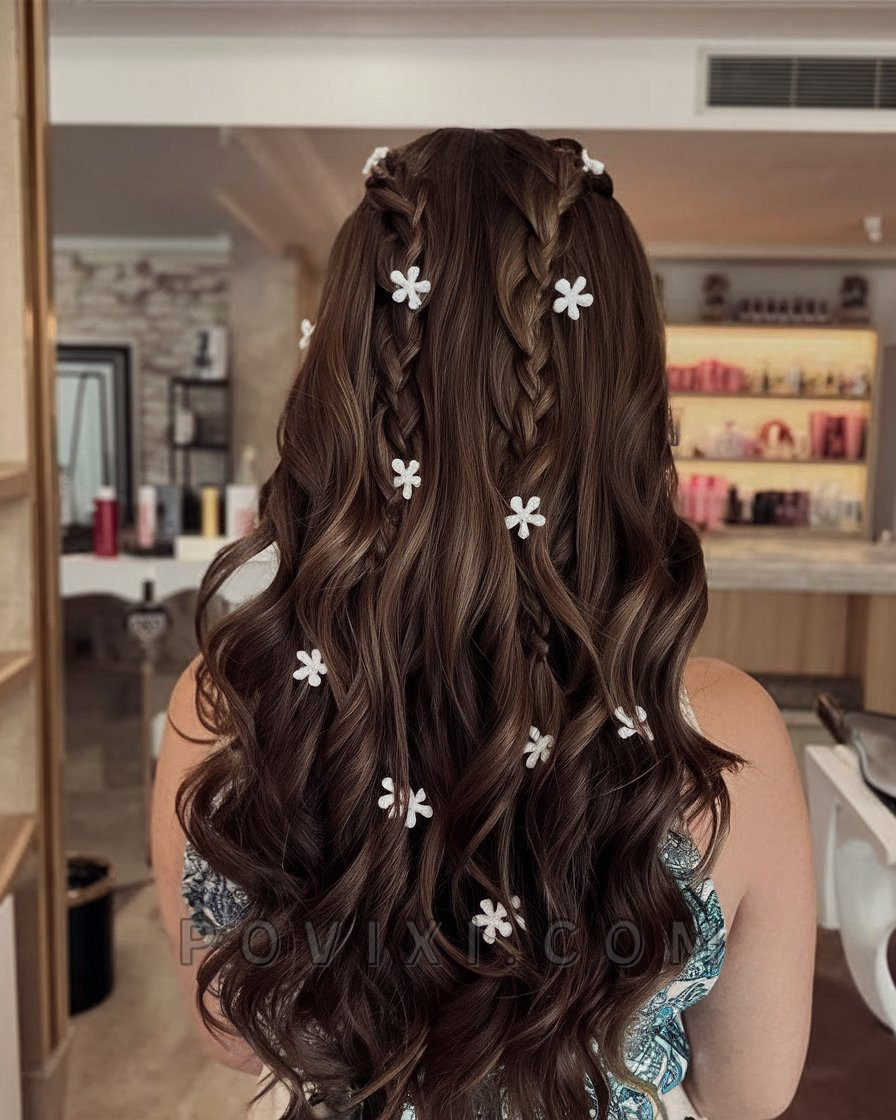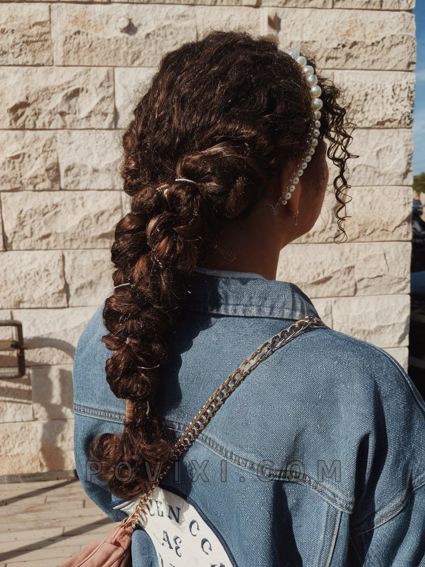 Add some flower power to your curls with this whimsical braided style. Featuring multiple loose braids and scattered flower clips, this look celebrates volume, texture, and playful femininity. It’s perfect for summer festivals or weekend garden parties. The style blends effortlessness with creativity, making it a cute, aesthetic pick for the season. Curl your hair using a wand to create large barrel waves, then gently braid a few front sections and pin them back. Use floral pins for that dreamy final touch. Pairs well with soft blue or green tones in your outfit to match the natural theme.