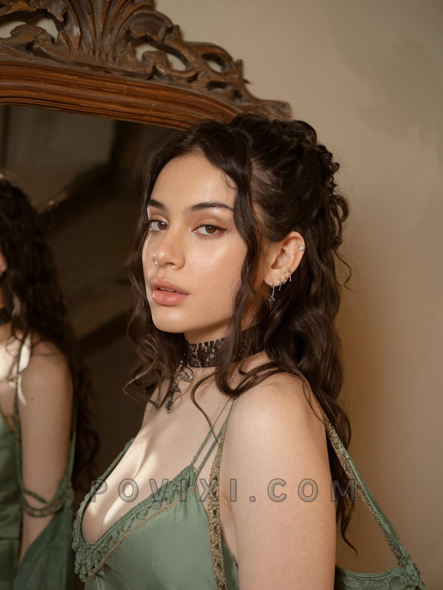 There’s something almost fairytale-like about this flowing hairstyle. Cascading waves fall over the shoulders while the upper portion is pulled back into a loosely braided chignon. The vintage green slip dress and antique-style choker play up the romance, giving this look an elevated evening vibe. For summer weddings or date nights, this one is a head-turner. Add shine spray and light-hold hairspray to maintain softness without stiffness.