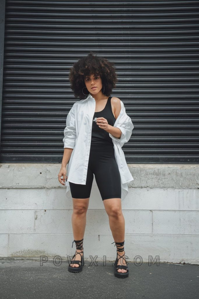 This baddie-inspired look is perfect for a relaxed yet fashionable summer day. A pair of fitted black biker shorts paired with a sleek black tank top provides a sporty yet stylish foundation. Layering with an oversized white button-up adds an effortlessly chic touch, making it a versatile outfit that works for running errands or meeting friends for coffee. Strappy sandals complete the ensemble, adding a touch of elegance to the athleisure vibe. You can elevate this outfit by accessorizing with bold hoop earrings and a statement handbag. For those cooler summer evenings, throw on a lightweight denim jacket to add dimension to the look.