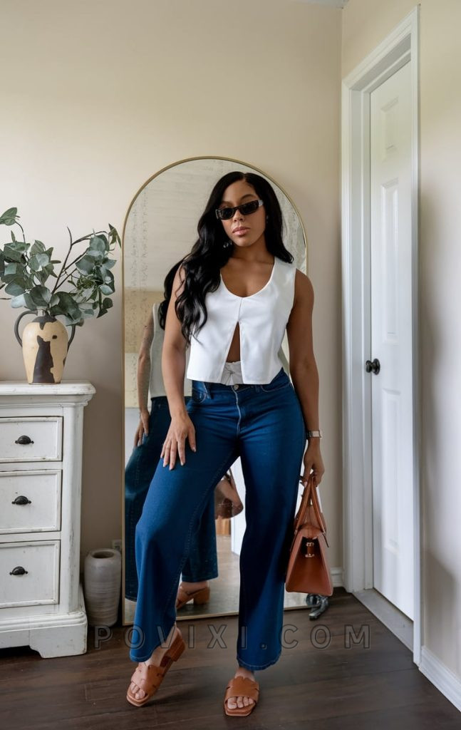 Denim is a summer staple, and this outfit offers a chic spin on a timeless favorite. Wide-leg jeans paired with a cropped white vest create a modern, effortless look that can be dressed up or down. Brown sandals and a structured handbag add a classy touch, making this an ideal choice for weekend outings or a casual office setting. The clean lines and minimalist silhouette make this a go-to outfit for those who appreciate understated fashion.