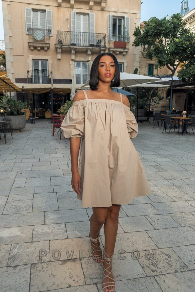 This beige, off-the-shoulder dress with oversized sleeves brings a balance of drama and effortlessness. Ideal for a casual lunch date or weekend getaway, this dress screams European summer chic. Complement it with lace-up sandals and soft waves for an effortless yet sophisticated aesthetic. The off-the-shoulder design enhances the collarbone, making it a flattering choice for various body types, including plus-size beauties. If you love a Parisian-inspired look, accessorize with a straw bag and red lipstick.