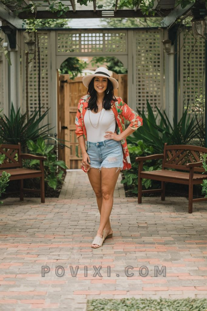 This plus-size-friendly outfit offers a fresh take on summer layering. A soft floral kimono draped over a white tank and distressed denim shorts exudes boho charm. The look is finished with bold orange pumps, adding a stylish contrast that makes it perfect for a vacation dinner date or a fun summer soirée. The flowy kimono provides coverage while keeping the outfit breathable, making it an ideal option for those who want to look stylish without sacrificing comfort. Accessorize with a woven handbag and some oversized earrings to complete the look.