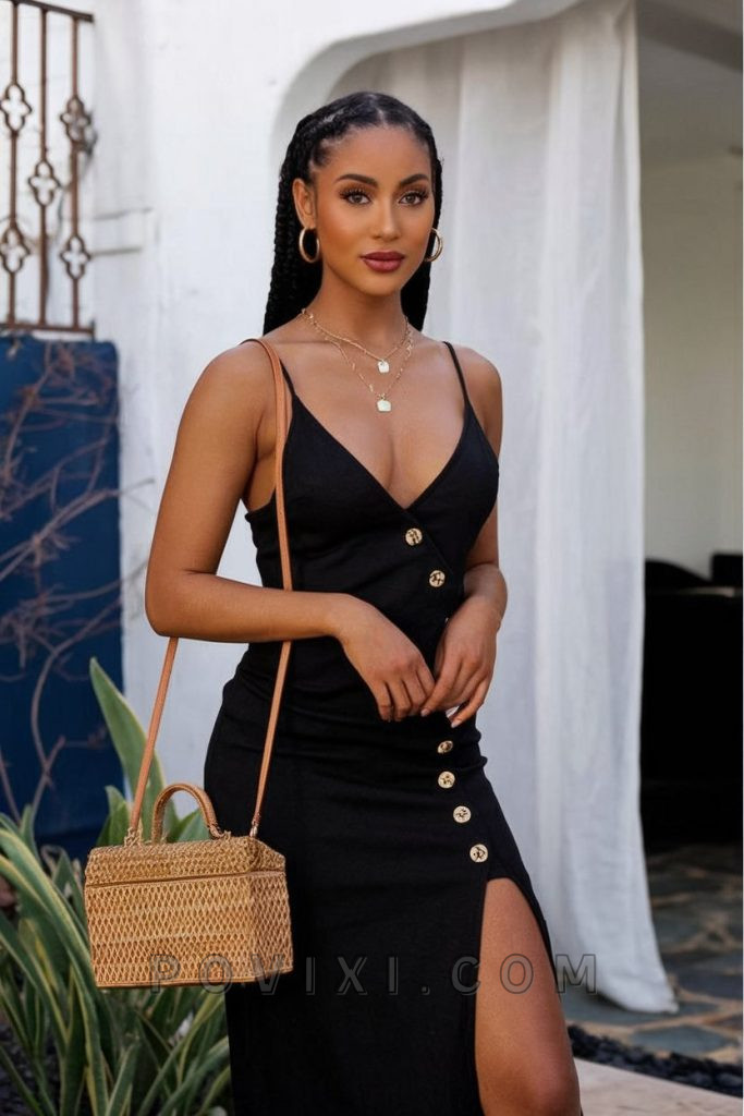 For the woman who loves a baddie look with a hint of elegance, this black slit dress with gold button details is a summer must-have. The deep V-neck enhances femininity, while the structured fit makes it effortlessly classy. Style this with bold red lipstick, gold hoop earrings, and strappy heels for a night out. If you’re feeling adventurous, throw on a cropped leather jacket for added edge.