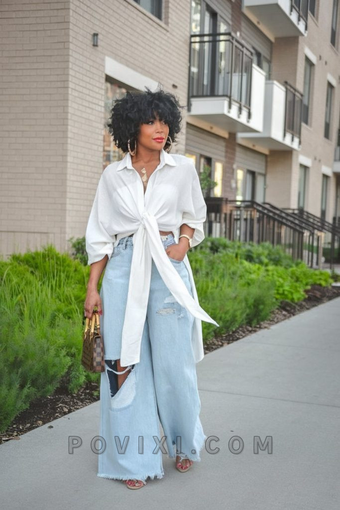 For a modern, effortlessly cool look, a crisp white blouse tied at the waist paired with distressed wide-leg denim is a must. This outfit is perfect for school, running errands, or brunch with friends. A classic white blouse is versatile and timeless—knot it at the waist for a trendier silhouette.