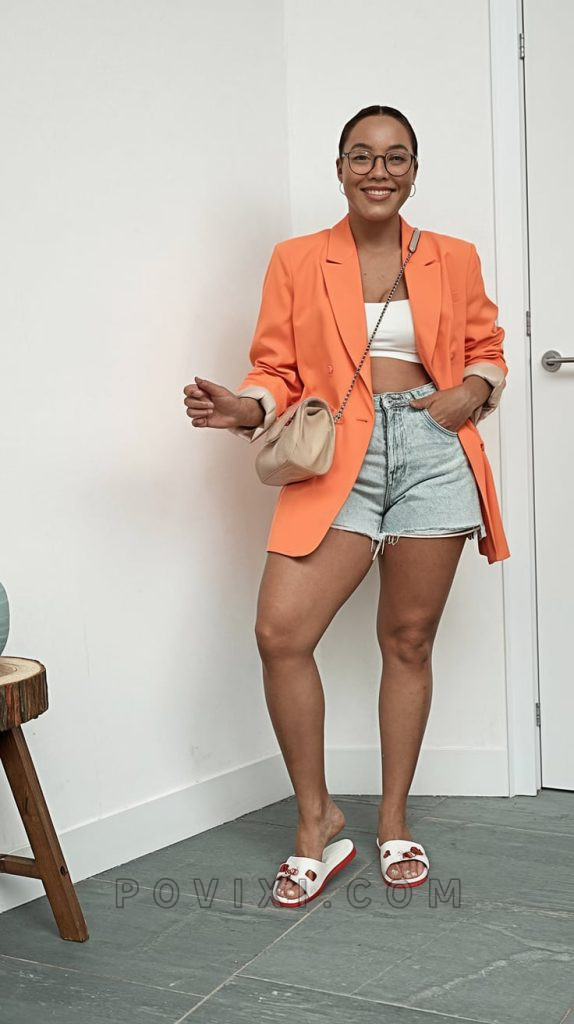Looking for a vacation-ready outfit that’s vibrant and sophisticated? A striking orange blazer layered over a cropped white top and distressed denim shorts blends casual charm with a put-together aesthetic. This look is perfect for summer networking events, brunch, or a day of exploring the city. White slide sandals complement the blazer’s brightness, making the outfit fun, fresh, and trendy. To add an extra layer of style, opt for a crossbody bag in a neutral shade and some delicate gold jewelry. The bold blazer makes a powerful statement, making this look ideal for those who love to blend structure with laid-back vibes.