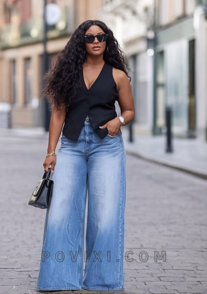 Channeling the best of ‘90s minimalism, this black vest and wide-leg denim pairing is sleek yet comfortable. The look balances baddie energy with everyday casual wear, making it a versatile summer outfit. Complete the look with black accessories, sleek curls, and oversized sunglasses for a touch of mystery.