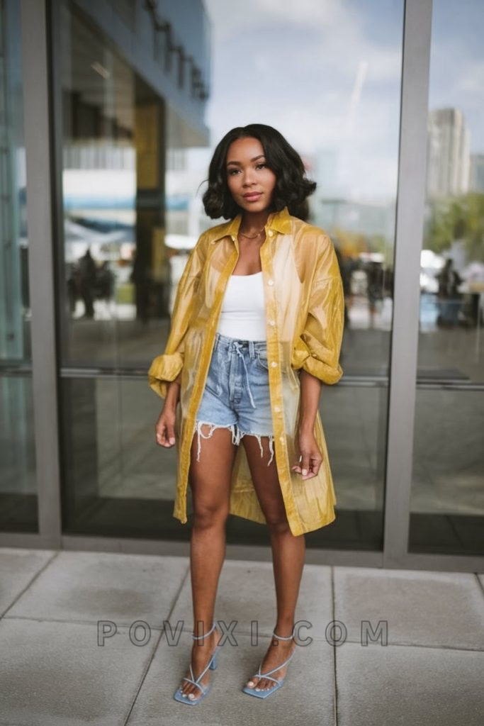 This summer look is effortlessly stylish, featuring a baddie-approved sheer yellow button-down shirt layered over a white crop top and high-waisted distressed denim shorts. The lightweight, flowy fabric is perfect for staying cool while making a statement. The outfit is styled with strappy pastel blue sandals, adding a pop of color while keeping the look breezy. Ideal for a rooftop brunch, a beach day, or even a vacation stroll, this outfit blends casual comfort with a touch of classy elegance.