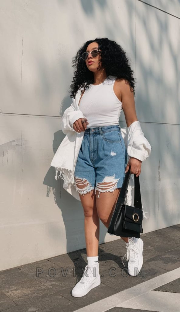 If you’re going for a casual but stylish aesthetic, this outfit is a must-try. A white ribbed tank top tucked into high-waisted, distressed Bermuda shorts strikes the perfect balance between sporty and chic. The oversized white jacket draped over the shoulders adds a fashionable edge, while white Nike Air Force 1 sneakers keep the look fresh and comfortable. This ensemble is great for running errands, school days, or a weekend out with friends.