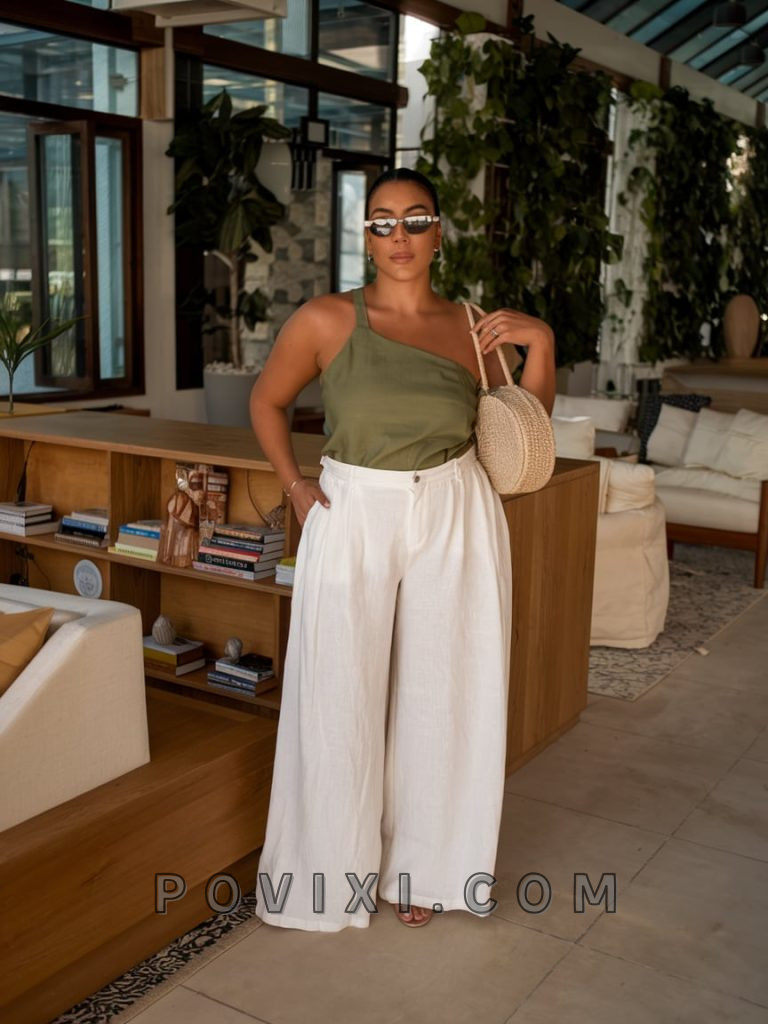 For a classy summer look that exudes sophistication, a fitted olive green one-shoulder top pairs beautifully with flowy white palazzo pants. This outfit is ideal for a vacation dinner, a summer wedding, or a fancy brunch. The neutral color palette highlights glowing summer skin, while the structured yet relaxed silhouette creates a balanced and elegant look.
