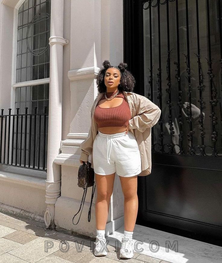This casual but trendy outfit is perfect for summer activities. A rust-colored ribbed crop top is styled with drawstring white shorts for a relaxed and comfortable vibe. Layered with an oversized beige shirt, this look is great for weekend outings, summer festivals, or a laid-back park hangout. The white chunky sneakers give it a sporty edge, while the mini bag adds a trendy touch.