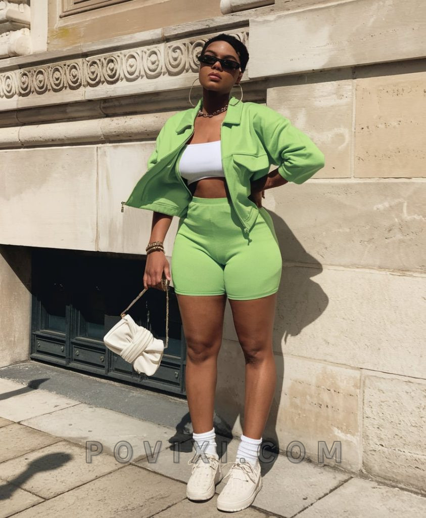 For the bold and trendy, this neon green cropped jacket and biker shorts set is a must-have in 2025. The fitted silhouette enhances curves, making it perfect for thick women who love embracing their shape. Styled with a white bandeau top, chunky sneakers, and gold hoop earrings, this look is sporty, modern, and undeniably cool. Ideal for a music festival, a casual day out, or simply turning heads on the street.