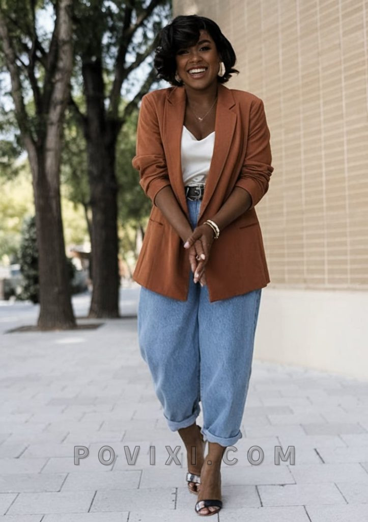 For a classy yet laid-back summer outfit, a rust-colored oversized blazer paired with relaxed-fit denim and a simple white tank is a timeless choice. The contrast between structured tailoring and slouchy denim creates a balanced look that’s perfect for work, brunch, or an evening out. Strappy sandals add an elegant touch while maintaining the effortless vibe.
