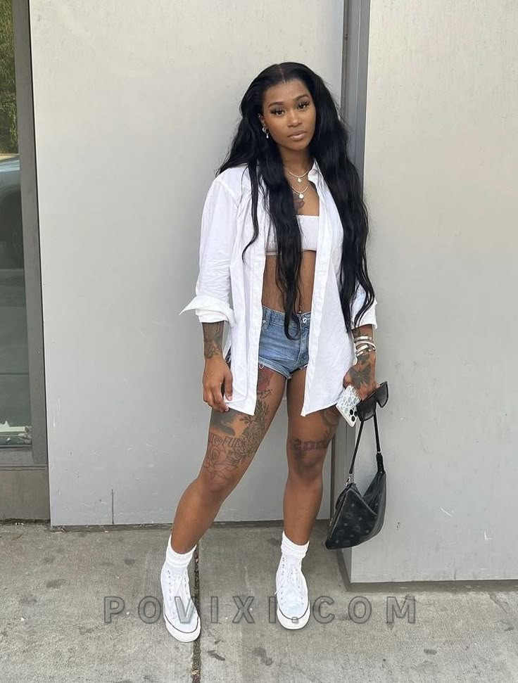 This outfit takes baddie energy to the next level with its effortless streetwear vibe. A crisp white button-up, left slightly unbuttoned, is paired with high-waisted denim shorts and a cropped top. Classic white sneakers keep it casual, while accessories like stacked bracelets and a small black handbag add a touch of edge. Perfect for city strolls and casual meet-ups, this outfit is a must-have for summer wardrobes. For those wanting an edgier aesthetic, swap out the sneakers for chunky platform sandals and add a bold lip color.