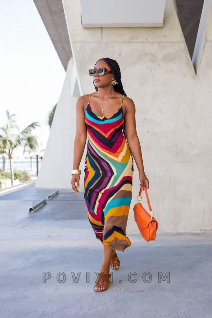 Nothing says vacation like a bold, multicolor maxi dress. The vibrant chevron pattern in bright summer hues creates a dynamic and energetic feel. Thin straps keep it breezy, while the fluid fabric flatters different body types. This is the ultimate statement piece for tropical getaways, school reunions, or beachside brunches. Pair it with nude sandals and a woven tote bag for a refined, vacation-ready look.