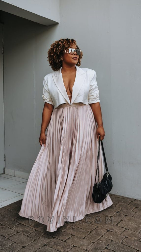 Glamorous Evening Look: White Cropped Blazer & Pleated Maxi Skirt