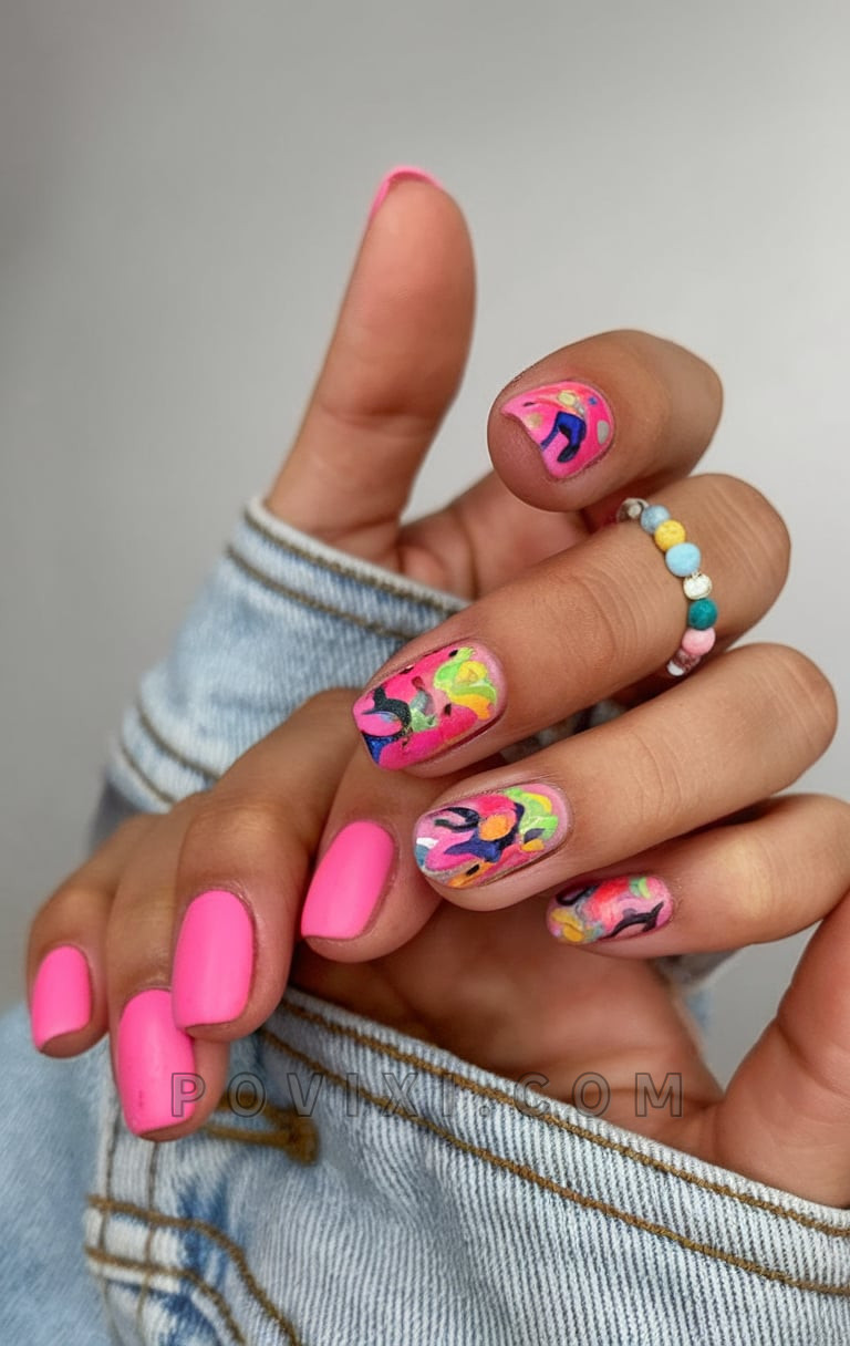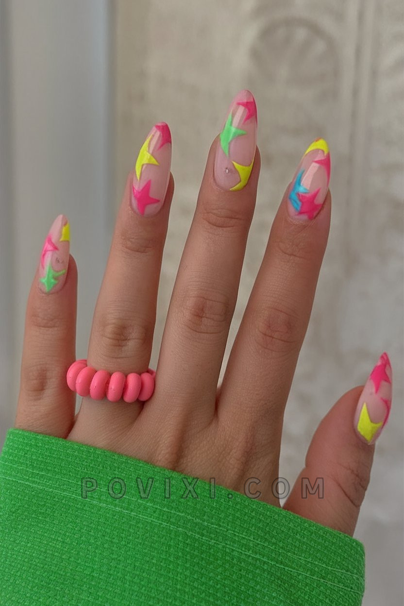 A design without hesitations offers unreserved coolness as its core attribute. Confident almond nails obtain their power from colorful neon stars set on a shiny nude foundation. A combination of intense hot pink, bright lime green, electric orange and sunny yellow emerges as a powerful cosmic explosion. You can sense nostalgic 90s house beats playing during this time. The flashy hot pink design works wonderfully for music events and sandy beach destinations along with all locations where you wish to display “activities for fun” through your nail display. This design suits people who enjoy artistic color pairing with daring choices.