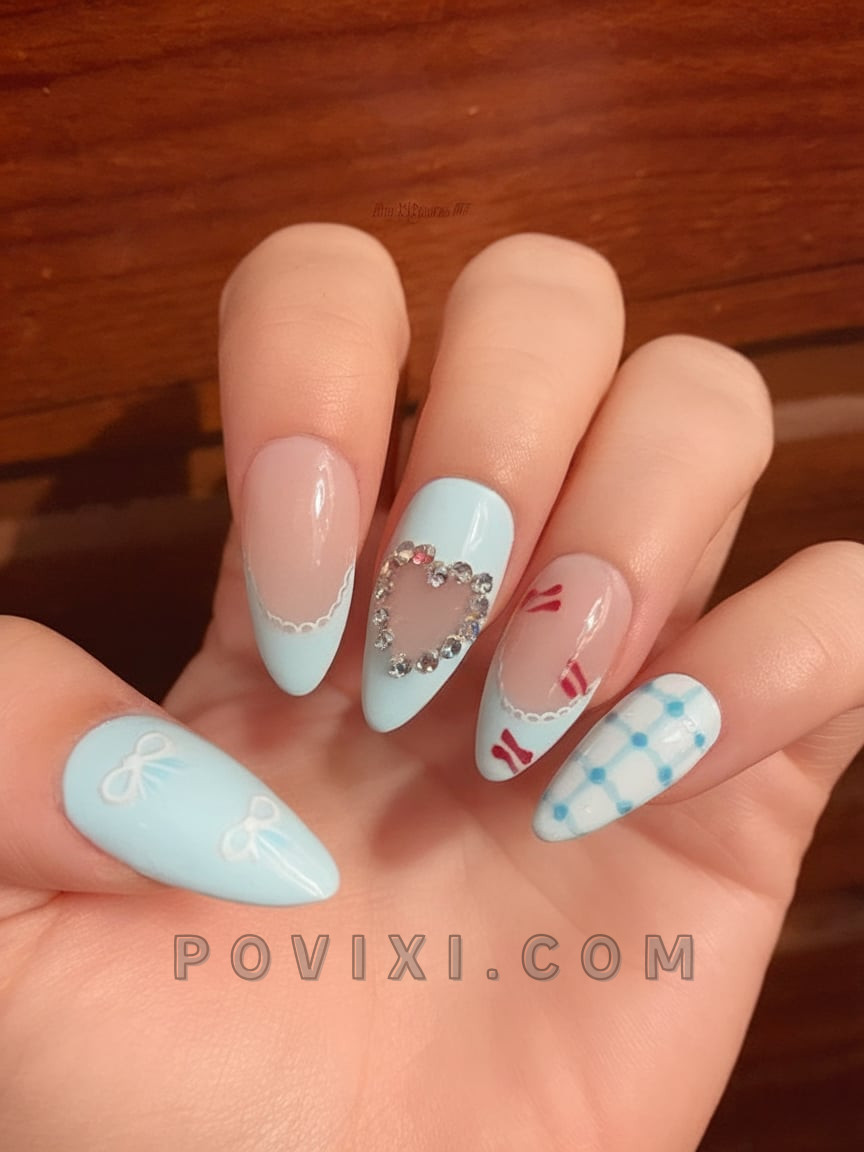 This manicure belongs to the emerging dollcore fashion trend since it displays delicate elegance together with vibrant heart-centered details. The almond nails’ enchanting baby blue appearance includes 3D rhinestone hearts as well as tiny bows and candy-cane kisses and white lace border trim. The set caters to individuals who use ballet flat shoes as staples and love stickers and have a habit of applying gloss on every outfit. Its youthful aesthetic presents a romantic charm.