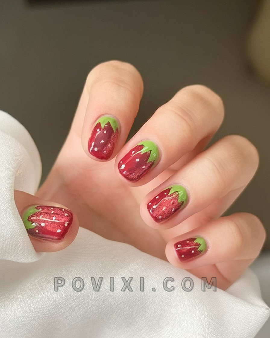 The short round nails exhibit a delectable appearance resembling strawberry confections. A deep ruby red glimmer covers the strawberry-shaped nail design because it has a finish resembling candies. The final touch includes small white seeds combined with green leaf ends. These nails combine cheerful delight with nostalgic charm as well as funky carefreeness into a brilliant intersection of vibrancy and fun along with charmed adorableness.