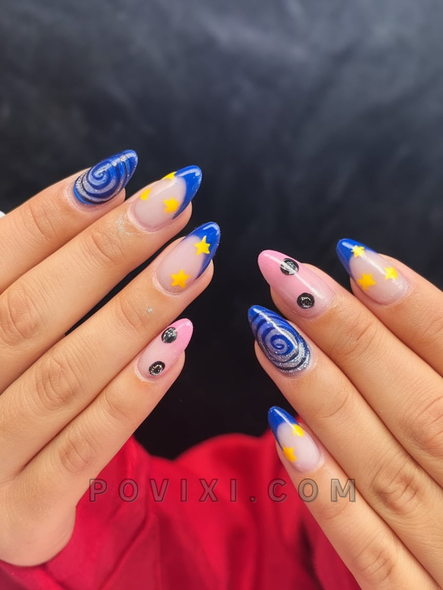 The extended almond nail set exists in a galaxy far beyond Earth. Saturday morning cartoons blend with cosmic beauty when blue galaxy French tips feature stars and cartoon eyes while yellow stars complete this out-of-this-world design. The design concept uses strategically placed negative space together with bare nails for tension against its striking element. Fashion enthusiasts who desire their nails to communicate stories should love this artistic statement which embodies 2025 trends.