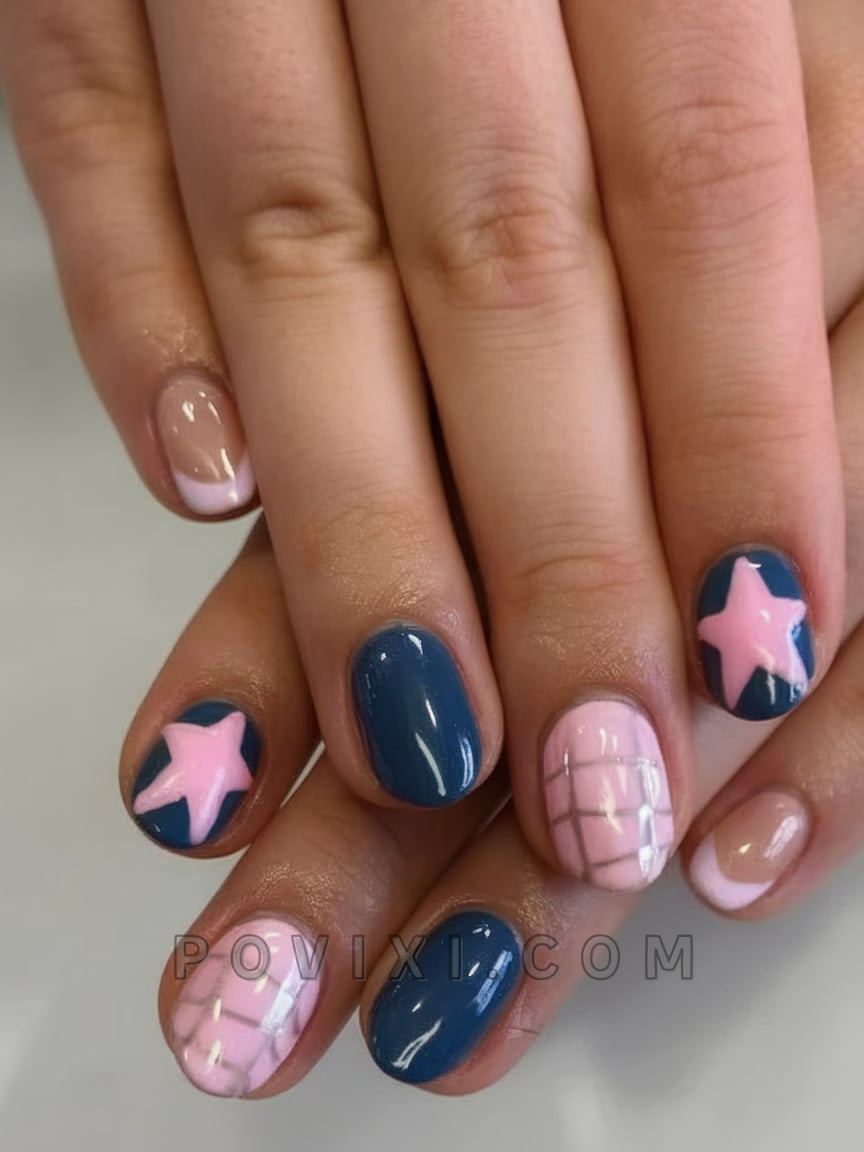 The current nail fashion trend of color-blocking receives a stylish modern update through this particular set. The design incorporates navy and blush and nude bases that meet oversized pastel pink stars crossed with grid textures for a DIY editorial effect. This oval contour on the nails softens the design elements which makes the complete look more approachable.