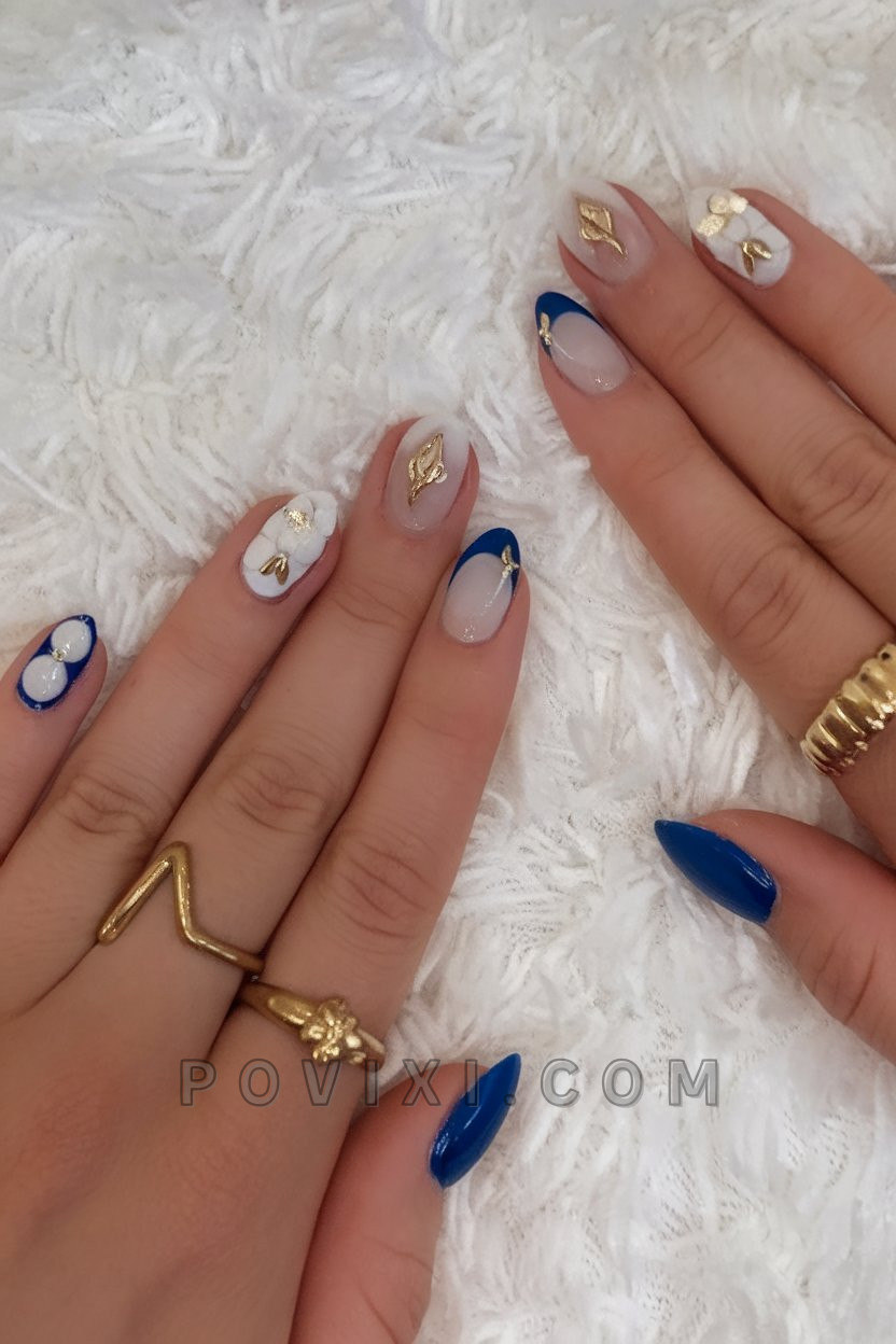 Geniuses of vibrant maximalism should consider the almond nail design which weaves together gold studs and deep sapphire blue and translucent petals with multiple textured layers. The design possesses both royal and soft characteristics. The design attains artistic excellence due to gold star decals and dimensional flowers as decorative elements. This nail style serves as an extravagant variant of funky nails while maintaining a playful playful essence.