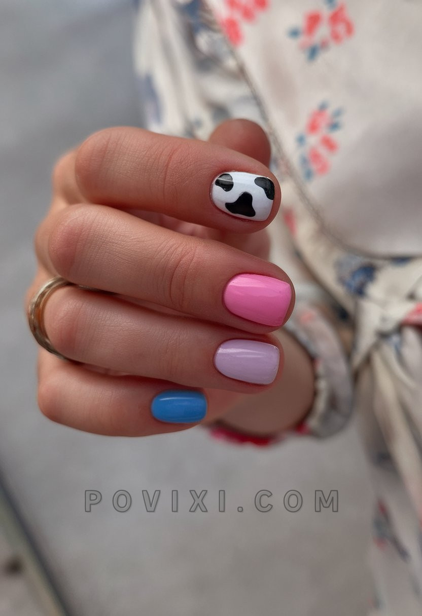 The short square design blends blush pink with powder blue and classic black-and-white cow elements in perfect combination of cuteness and sophistication. The aesthetic design achieves an ideal mix of adorable flair and fashionable elegance which produces youthful yet accessible color arrangements. The style achieves both Yeehaw aesthetics and Kawaii themes simultaneously.