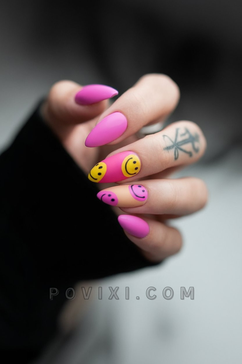 The lengthy almond-shaped matte design captures all the charm we seek in 2025 through its lively nature along with its offbeat charm. Smiley faces composed of black ink float within a hot pink and orange colored background. The modified shapes of emojis in this design create a funhouse effect which increases their personality. The nail design represents someone who chooses a laidback approach toward life just as summer season resonance matches this casual attitude.