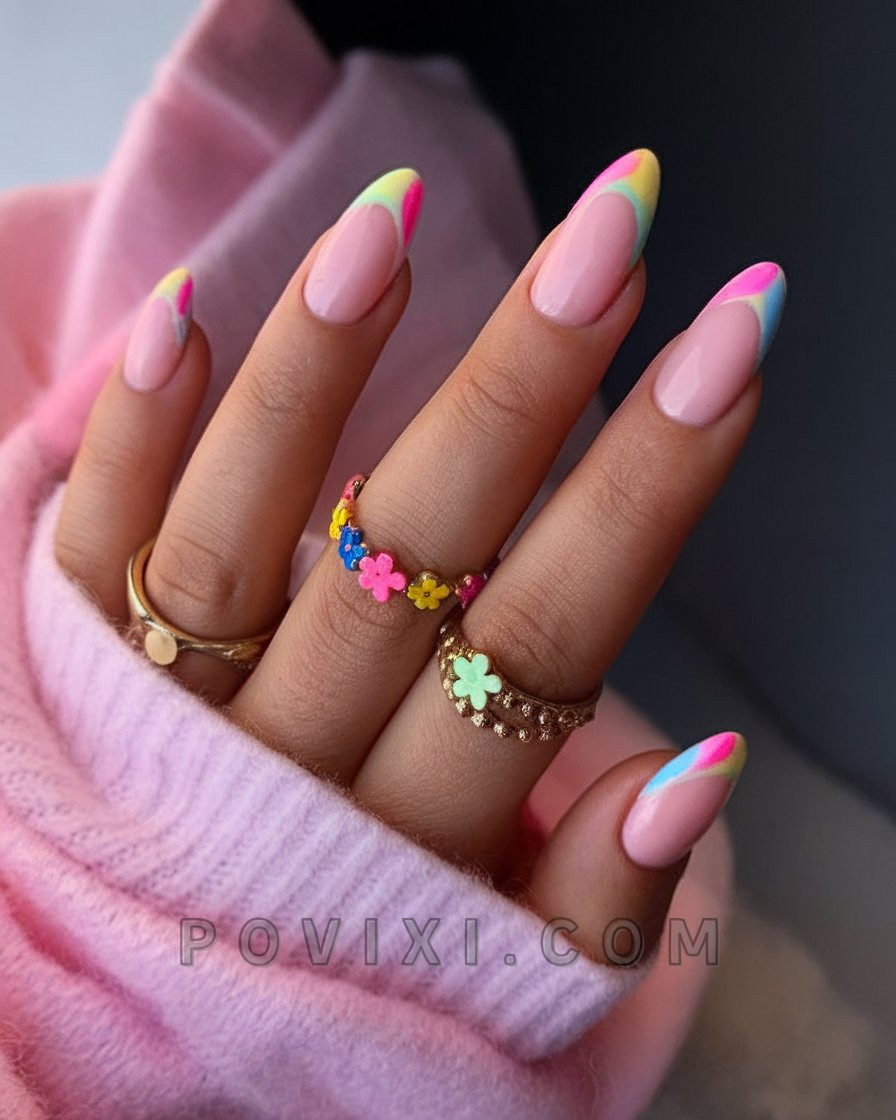Factored in with a Technicolor twist are traditional French tip designs. The almond nail design uses rainbow waves like mint, coral, violet, sunshine yellow which cover a neutral base instead of traditional white French tips. These gentle waves around the tips display a resemblance to the refreshing taste of tropical drinks under the summer sun. The chic yet happy design works perfectly as summer fashion for beach get-togethers or wedding days.