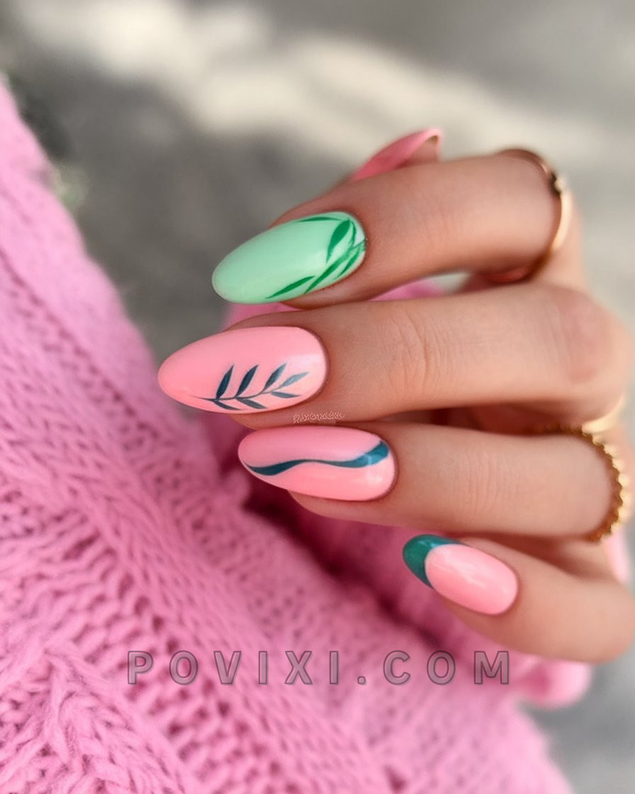 This almond-shaped set of delicate and fresh tonalities presents soft pink, coral, mint tones and hand-painted blue leaves with graceful brushstrokes. The artistic quality of this design creates an impression of Monet’s paintings blended with Miami’s charm. The design serves easy-chic styles without losing the possibility to try edgy designs. The leaf details create both subtle movement and soft elements while the area of no polish creates a distinctive interaction between solid and open spaces.
