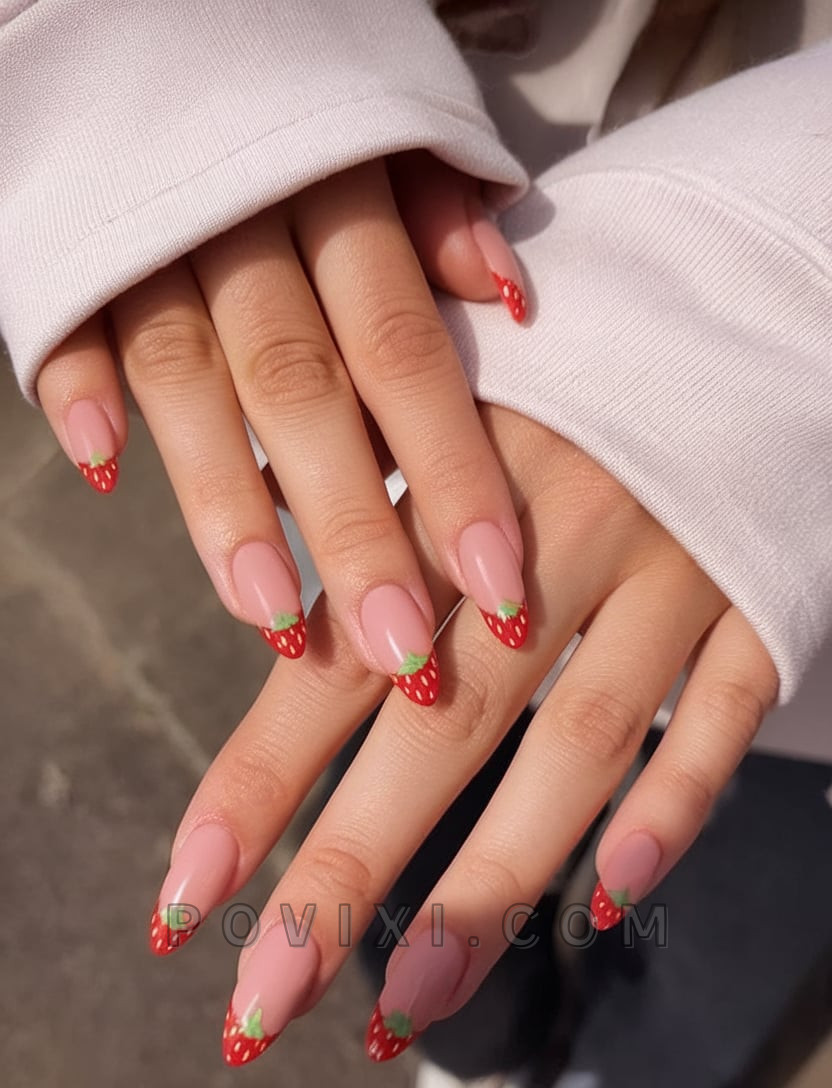 A revitalized French tip achieves its juicy reinterpretation through this design. Every nail features a red strawberry style that includes white decorations and green natural-looking edges at the surface. The minimalist nail base allows the berry color to stand out brilliantly while providing a funky and flirty appearance. These almond-shaped nails are medium in length which allows daily wear but stands out as a distinctive choice.