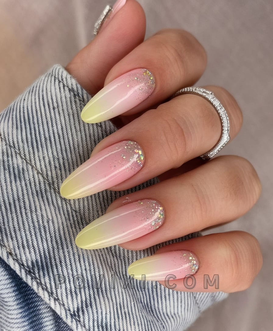 There’s something unmistakably radiant about the fusion of lemon-yellow tips and glittery pink bases. The summer 2025 feel that this set represents appears through its long almond-shaped design which creates beautiful length for fingers. During the day the gleaming pink gradually transitions to energizing yellow like enjoying poolside margaritas under the warm sunshine. The set offers captivating bright color in a sophisticated way for anyone who seeks distinctive style. The nail look works best with a white sundress and gold accessories because they highlight the warm colors in this design.
