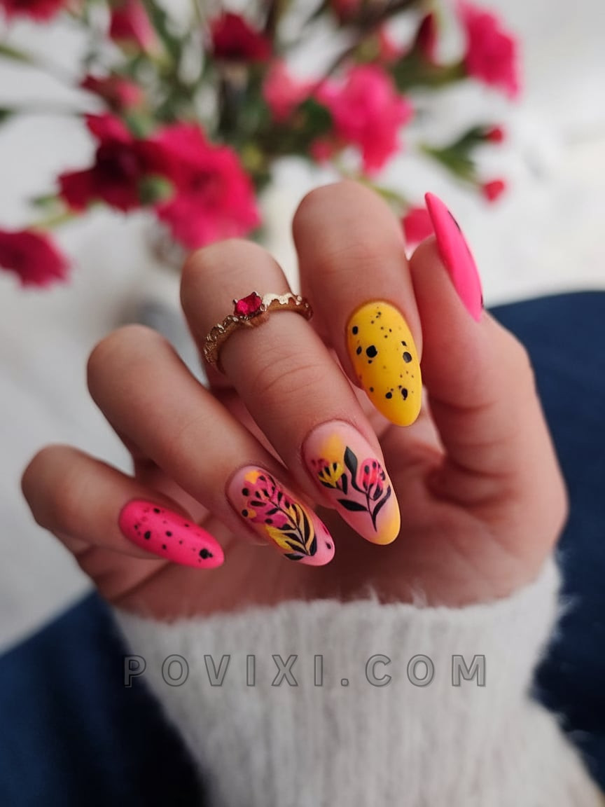 The nail set offers more than regular art since it delivers a vibrant celebration that combines colorful patterns together with summer party spirit. These nails combine its vibrant pink and yellow matte finishes against black-drawn tropical leaf art for an unmistakable tropical vacation look. The almond nail shape maintains a gentle Silhouette but eye-catching combinations of colors dominate the appearance. This fun design suits casual events such as summertime musical events as well as beachfront dining occasions. Nail advocates from both professional work and social media platforms actively favor bold prints because maximalist beauty trends are anticipated to dominate 2025.