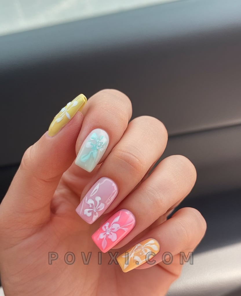 The nails transformed into 3D flowers create exceptional garden-themed embellishments for your hands. Each nail in this square design features one of five pastel bases that consists of lavender, mint, pink, coral, and sunshine yellow background colors underneath layered textured flower shapes. Each nail offers gentle and deep-colored schemes which present like melting frozen confection. This nail set proves interesting because it creates artistic designs which can be worn casually. Soft linen clothing combined with any summer dress would become a perfect match for this nail design.