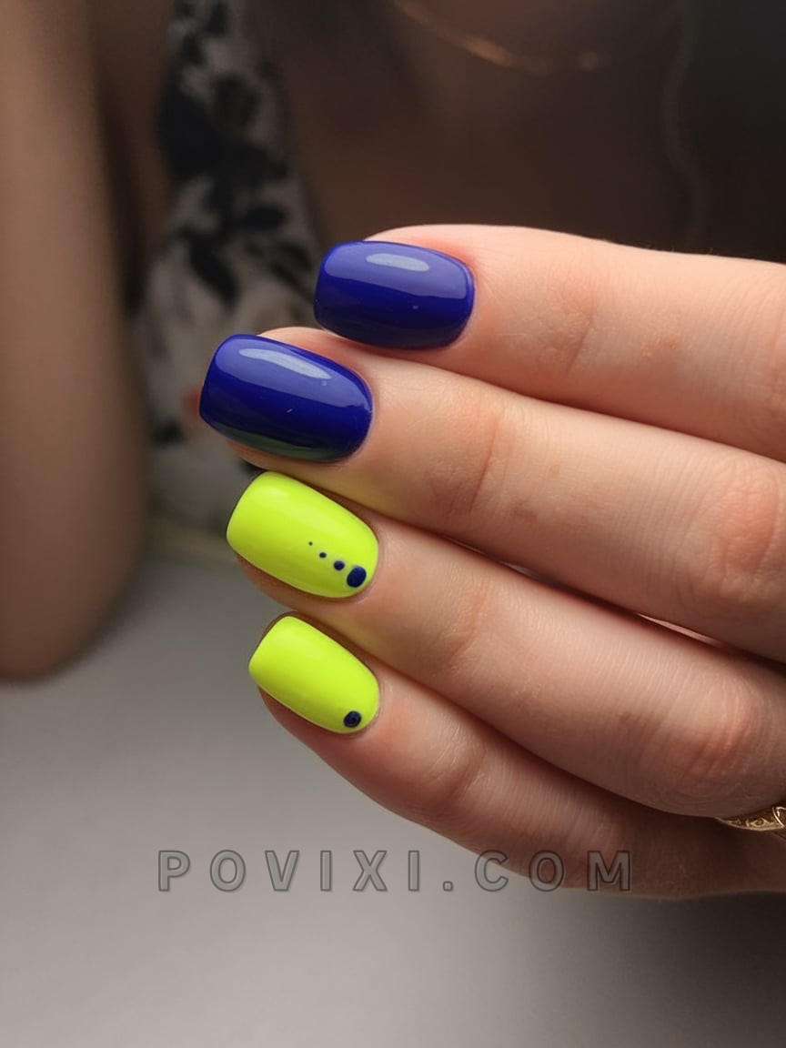 For anyone who loves dramatic yet clear contrasting styles this particular look should be your screenshot choice. Short square nails achieve instant attention with high-gloss blue and acid yellow paint combination. The classy nature of this style comes from the minimal and purposeful nail dot work that makes each nail unique. Women who prioritize modern looks through simple maintenance decisions would find this easy two-color palette to be the perfect choice. The 2025 season in New York editorials has adopted this nail design as their signature variation which demonstrates that playful designs never need to go overboard.