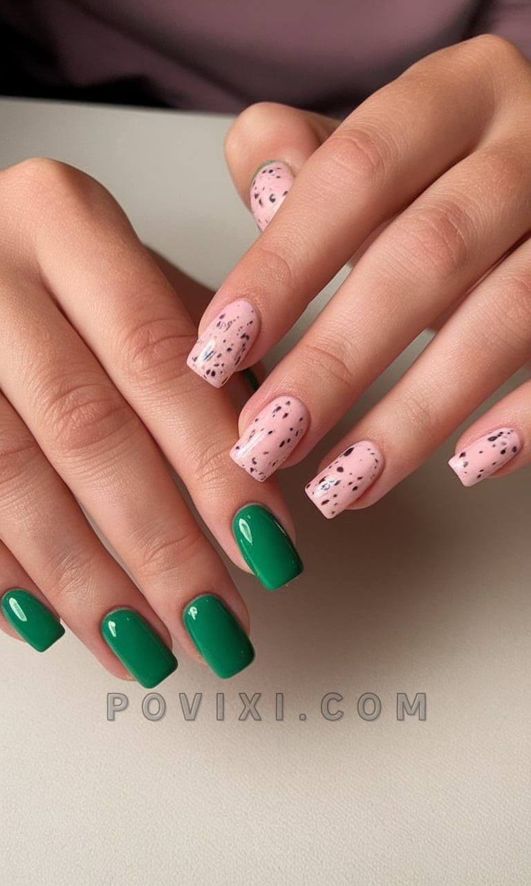 The combination of simple yet charming neutral tones achieves the perfect elegance in this nail set. Short square nails receive a powerful structure from their form while beige with black specks alternate with forest green. The cool contemporary design makes this perfect for relaxed weekend activities together with creative workplace duties. A combination of both rough speckled polish and strong green delivers funky concerns and bold details. People who like blending organic base colors with strong accessory details can use this straightforward concept.