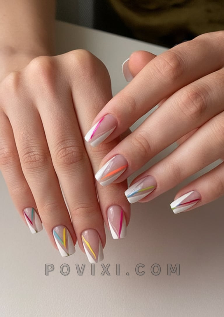 The set delivers pure dreams for individuals who love both clean lines and rich color saturation. These square nails rest on a basic nude color while integrating diagonal stripes made from various hues plus perfect white tip frames for a modern design. The design creates a connection between contemporary art trends and the joyful summer atmosphere. The individual nail differences create a cohesive ensemble which achieves funky style but with no element of chaos. The vibrant lines in orange, green, pink and violet paint 2025’s spirit on these nails and their colorful design forgives any outfit from day wear to party fashion.
