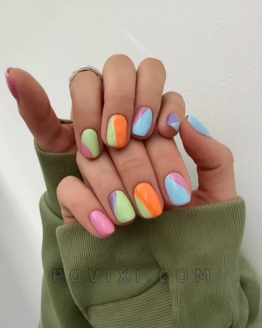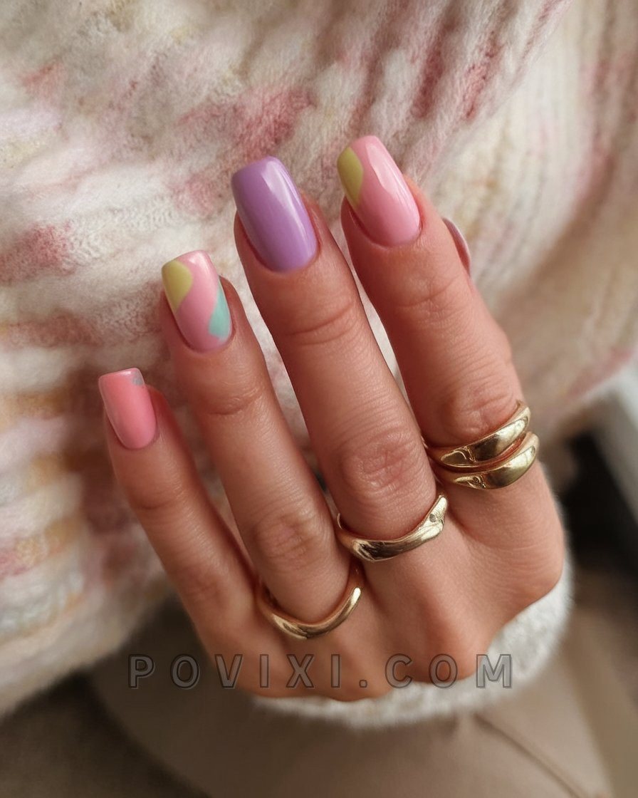 The nail set follows 2025 trends through its sculptural patterns and dominant swirling colors that create a soft almond square design. The pastel-colored ribbons featuring blue, pink, yellow, green and lilac appear hand-painted across a milky base which creates a smooth artistic effect. The style presents an enjoyable and flexible appearance that delivers both expression along with functional versatility. The nail design fits both gallery appearances and family get-togethers equally well. The stunning outlook of this design combined with its polished presentation quality marks it as an idea you need to save immediately.