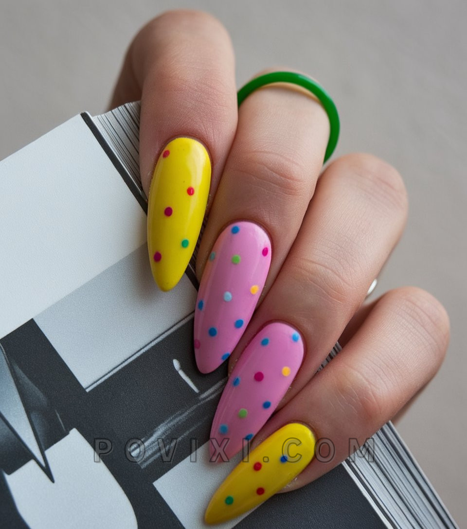 The rule exists that parties cannot take place on nails but this statement destroys that belief. The coffin-shaped design presents itself as a joy-filled arrangement. Alternative nail sections painted candy colors with polka dot design create the appearance of cupcake sprinkles. These nails communicate strong summer fair emotions through their joyful nostalgic interpretation of playfulness. This vinyl smooth finish creates bright color vibrancy and the arranged color distribution resembles digital artistic pop patterns.